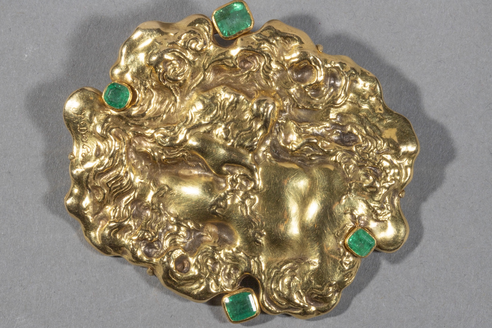 From that year onward, Desbois collaborated with the distinguished art founder and dealer, Adrien-Aurélien Hébrard (1865–1937), who undertook to produce his jewellery in gold. Desbois thus created a series of sculptural brooches in yellow gold adorned with pearls or emeralds. In 1905, at the French Art Exhibition in Berlin, he presented under no. 73 a “brooch, patinated gold and emerald.” Could this be our jewel — also in gold and set with four emeralds framing, against a background of foaming seawater, a delicately modeled female figure seen from behind, raising her left hand as if to gather her hair? The model was in any case reproduced in 1908 in a catalogue published by the Maison Hébrard dedicated to women’s jewellery.