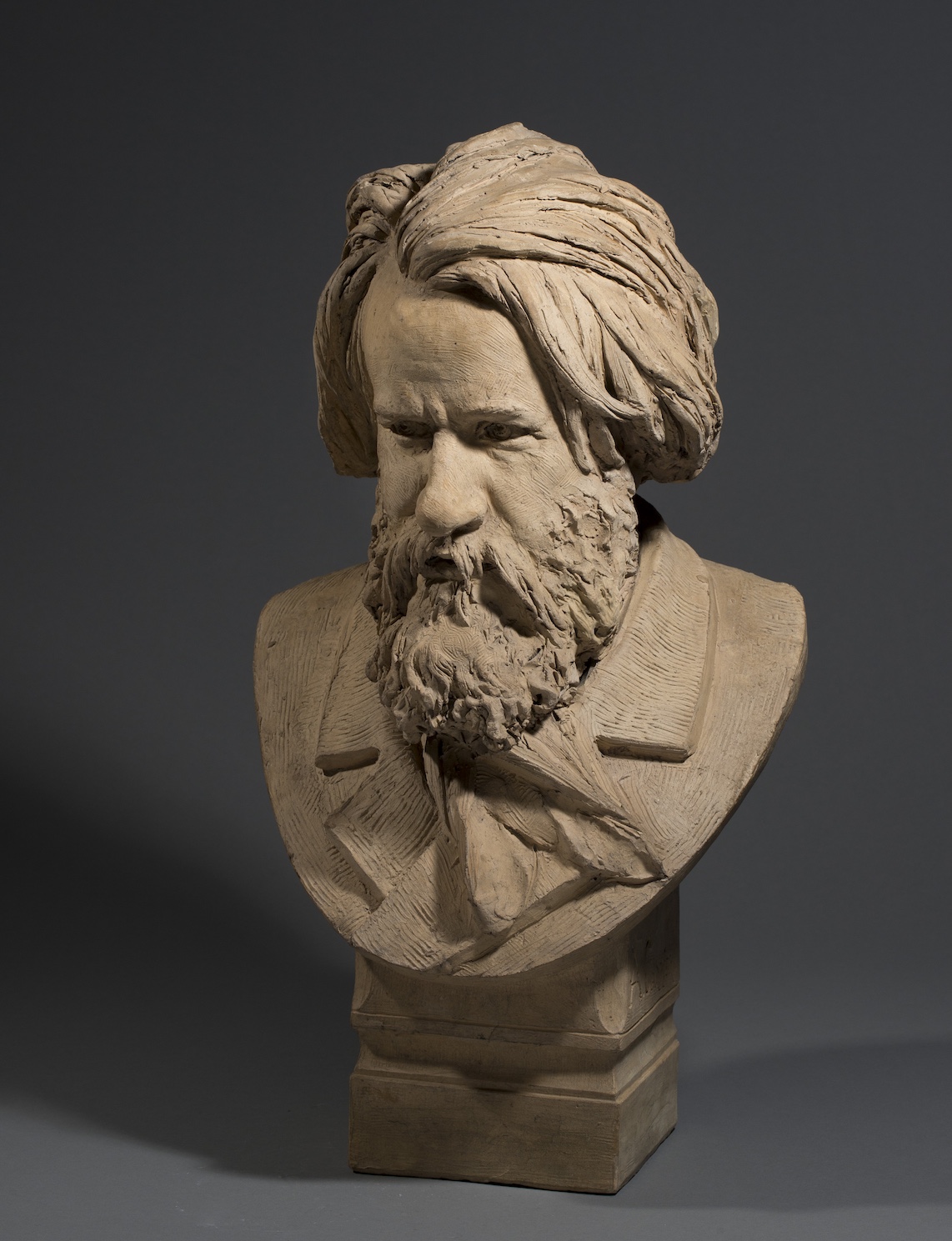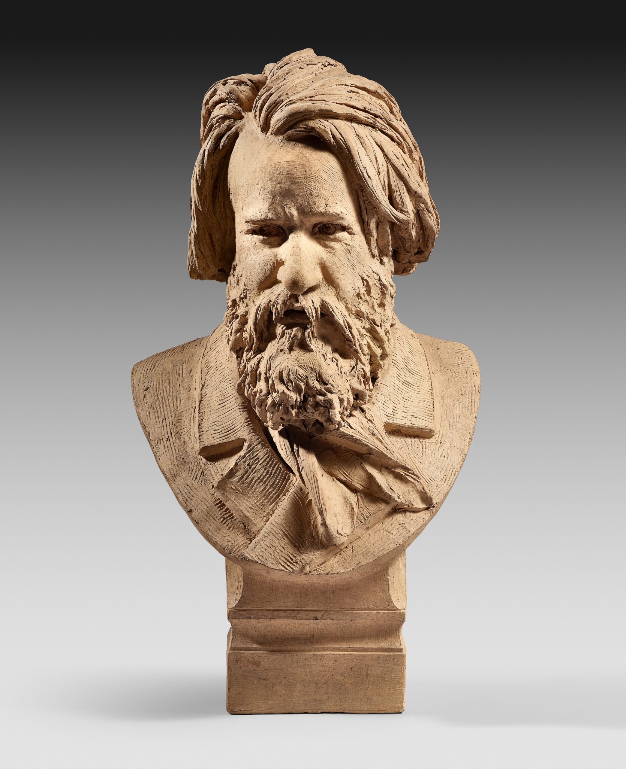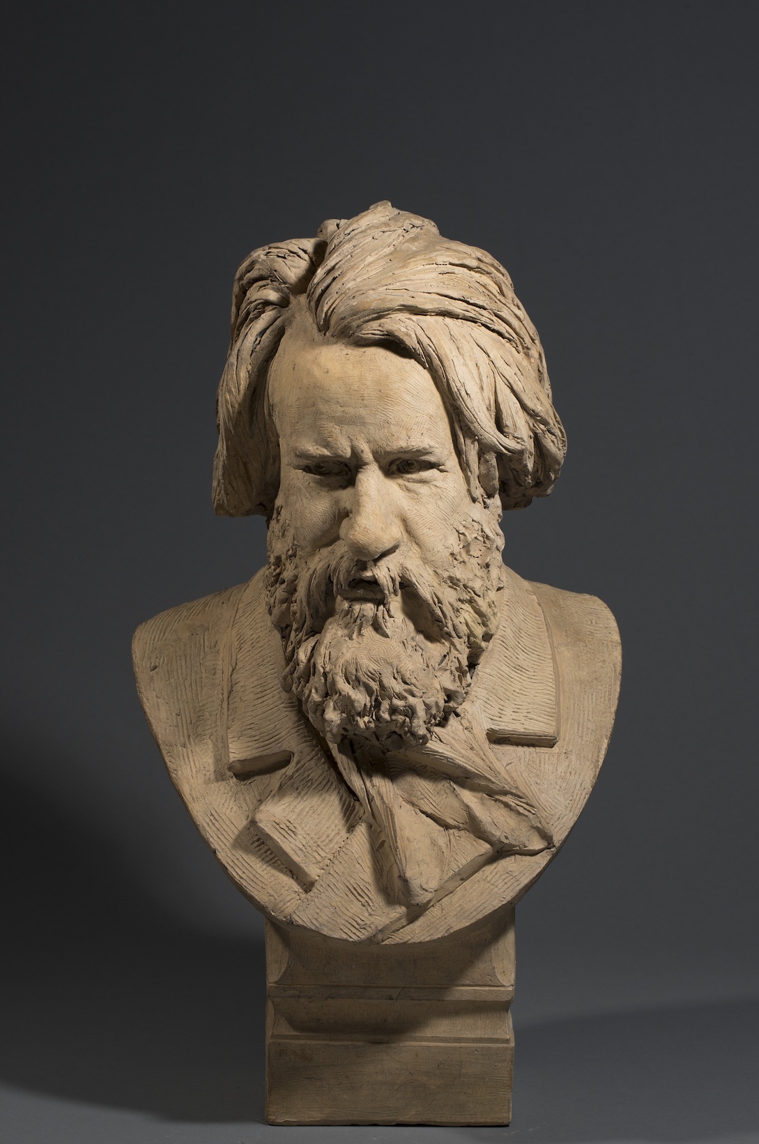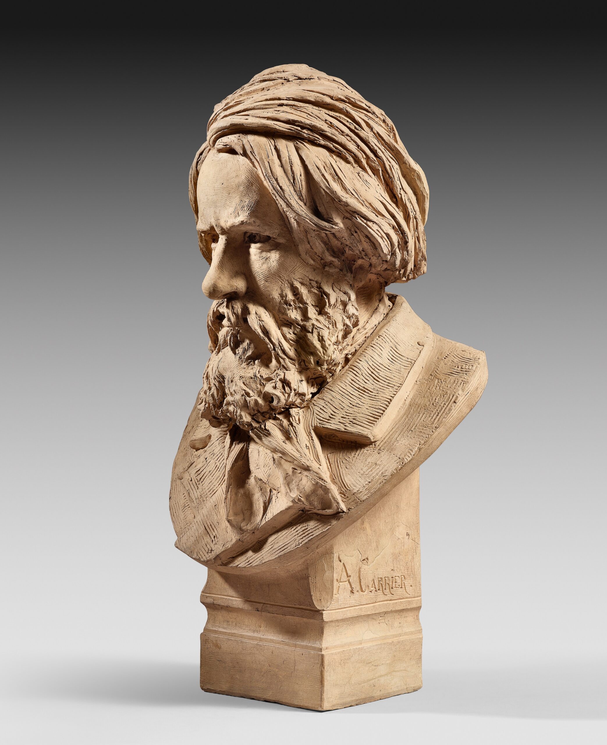 Ce buste particulièrement saisissant est une terre cuite originale et unique, et non une œuvre d’édition sortie de l’atelier de Carrier Belleuse. Il s’agit d’ une œuvre personnelle d’une grande rareté.