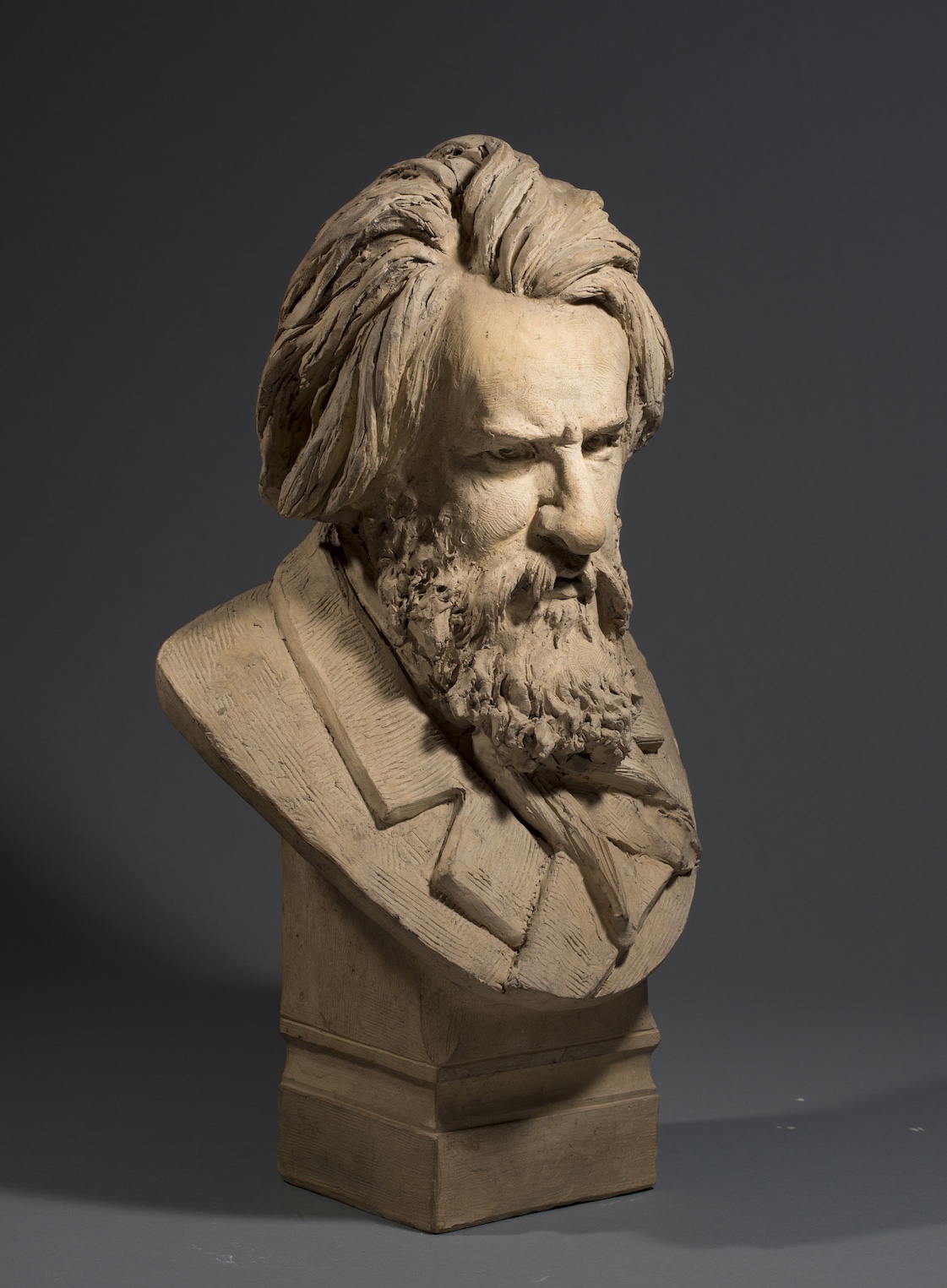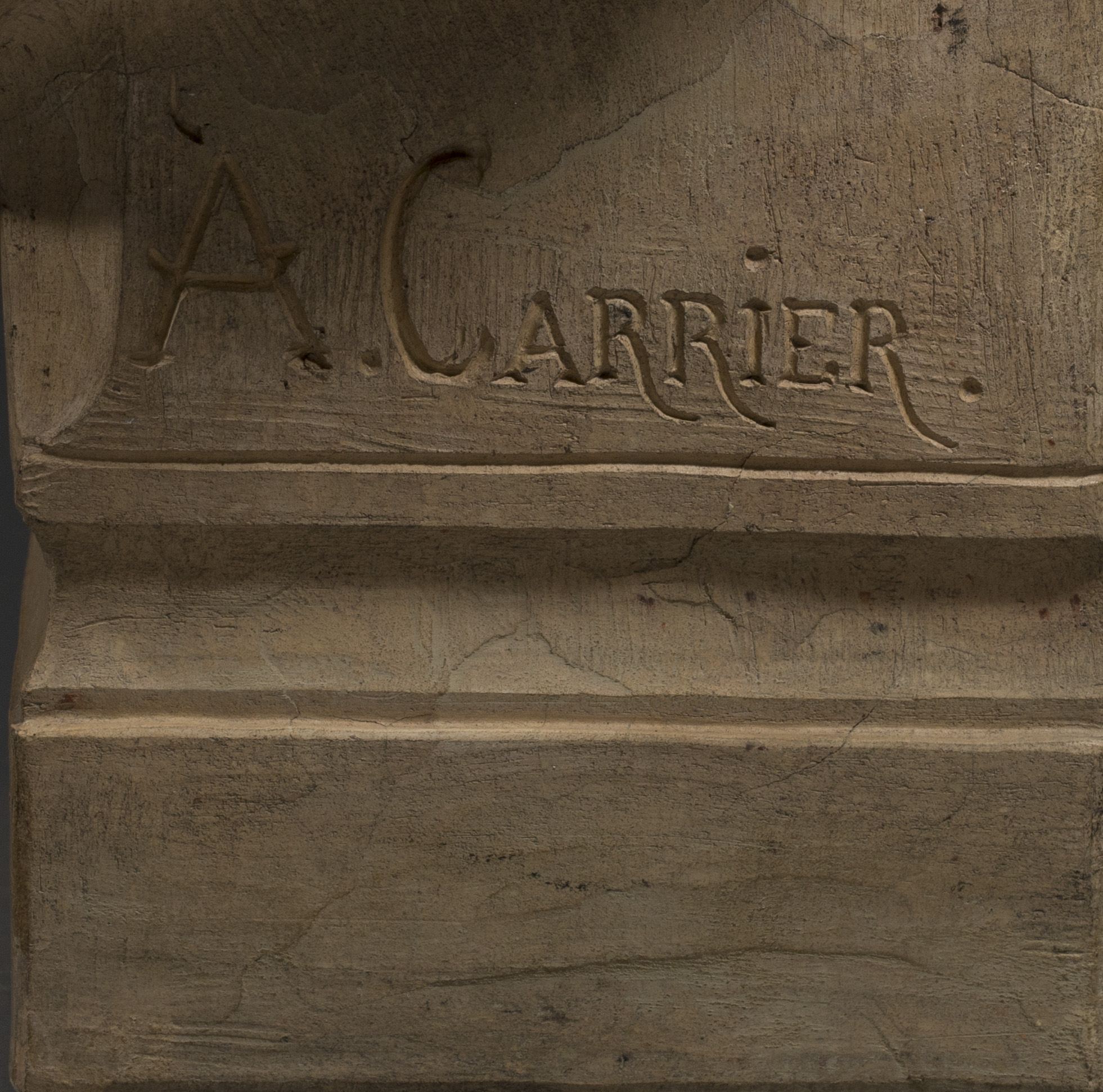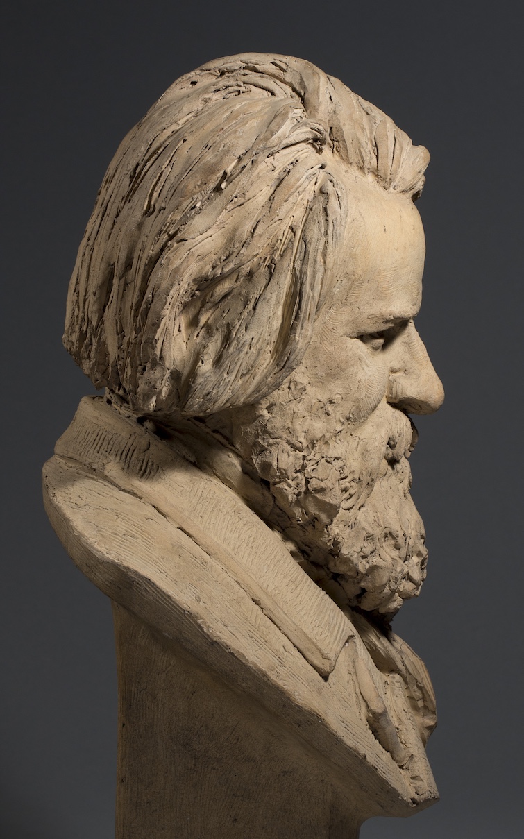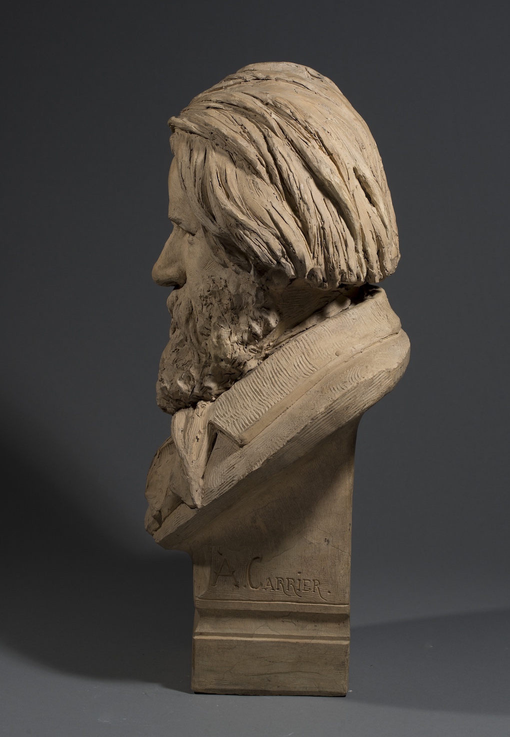 Albert-Ernest Carrier-Belleuse fut l’un des sculpteurs les plus célèbres et certainement les plus omniprésents du Second Empire. Après ses débuts dans un atelier d’orfèvre, il gravit les échelons de la formation de sculpteur jusqu’à la consécration au Salon. « C’est presque une machine à sculpter … Chaque jour sortent de son atelier des bustes, des ornements, des statues, des statuettes, des bronzes, des candélabres, des cariatides. » (Edouard Lockroy, « Le Monde des Arts », L’Artiste, vol 77, 1865, 40). Il fut un grand portraitiste et choisissait ses bustes pour renforcer sa crédibilité grâce à la notoriété de ses modèles. Il sut par exemple attirer l’attention de l’Empereur au Salon de 1861 avec le Napoléon en Italie ; toujours à ce même Salon, il présenta des bustes de personnalités issues de l’élite culturelle et politique, l’historien Ernest Renan, l’homme d’état Jules Simon, des artistes, trois célébrités de la scène, un important abbé. Le sculpteur choisit de donner à ses portraits plus de vérité que dans les représentations idéalisées à la mode, il est capable de marquer le caractère et la vie de chaque physionomie. La recherche de ressemblance est toujours frappante, comme ici dans ce portrait en buste d’Auguste Luchet. L’homme de lettres, socialiste, est représenté sourcils froncés, yeux incisés, saisi dans une expression d’intense concentration qui révèle toute la dimension psychologique du personnage.