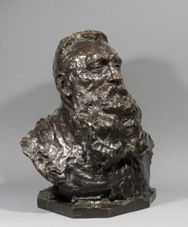 Mais la mort surprit Falguière avant l’achèvement du buste, qui fut trouvé dans son atelier « à peine ébauché ». En hommage à son ami, Rodin en fit mettre une photographie en frontispice du catalogue de son exposition rétrospective au Pavillon de l’Alma en 1900. Il en supervisa également personnellement la fonte confiée à Hébrard. Notre fonte est de qualité exceptionnelle ce qui laisse présager de l’intervention du maître.