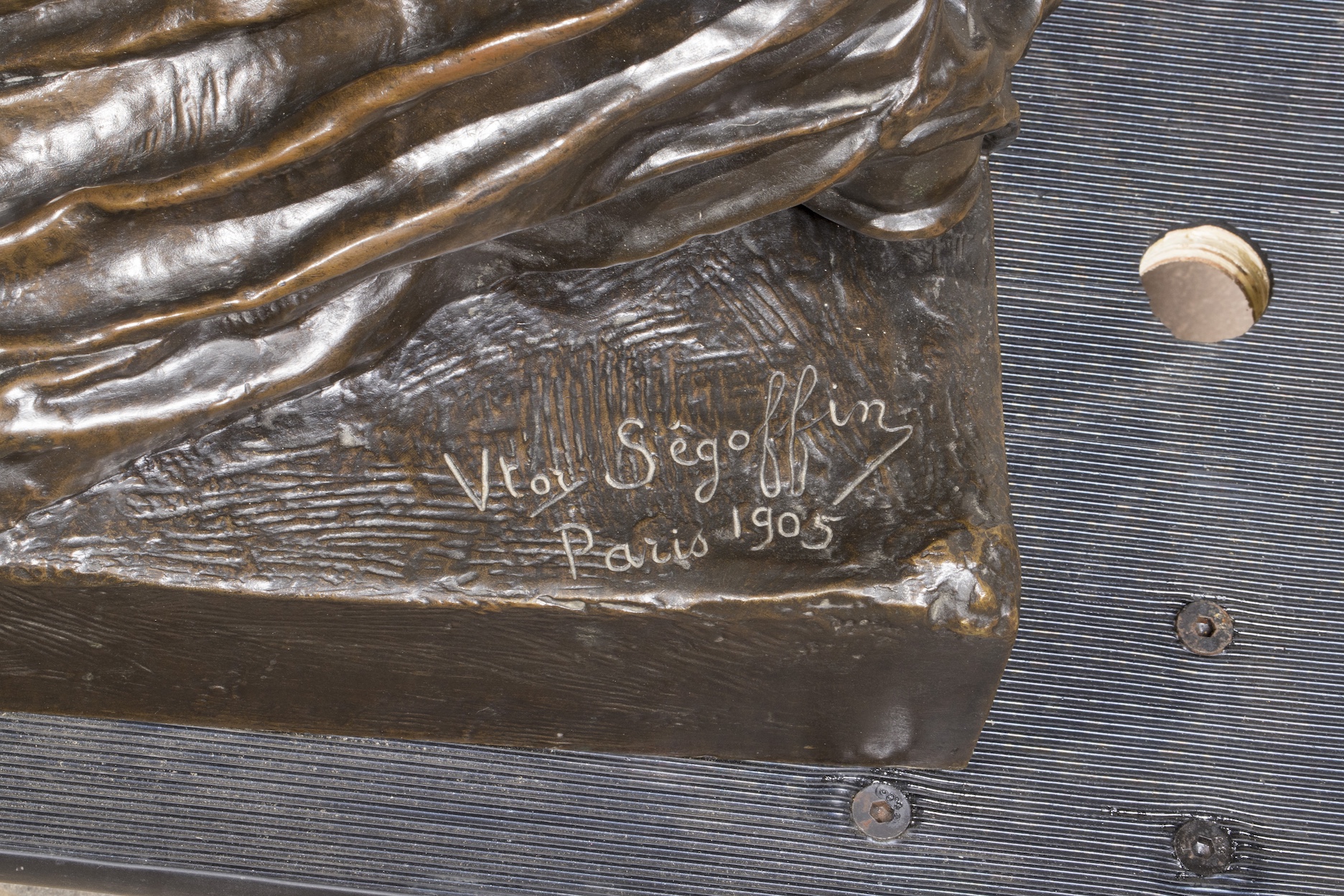 Chef modèle en bronze à patine brun nuancé, signé « Vtor Ségoffin », situé et daté « Paris 1905 »