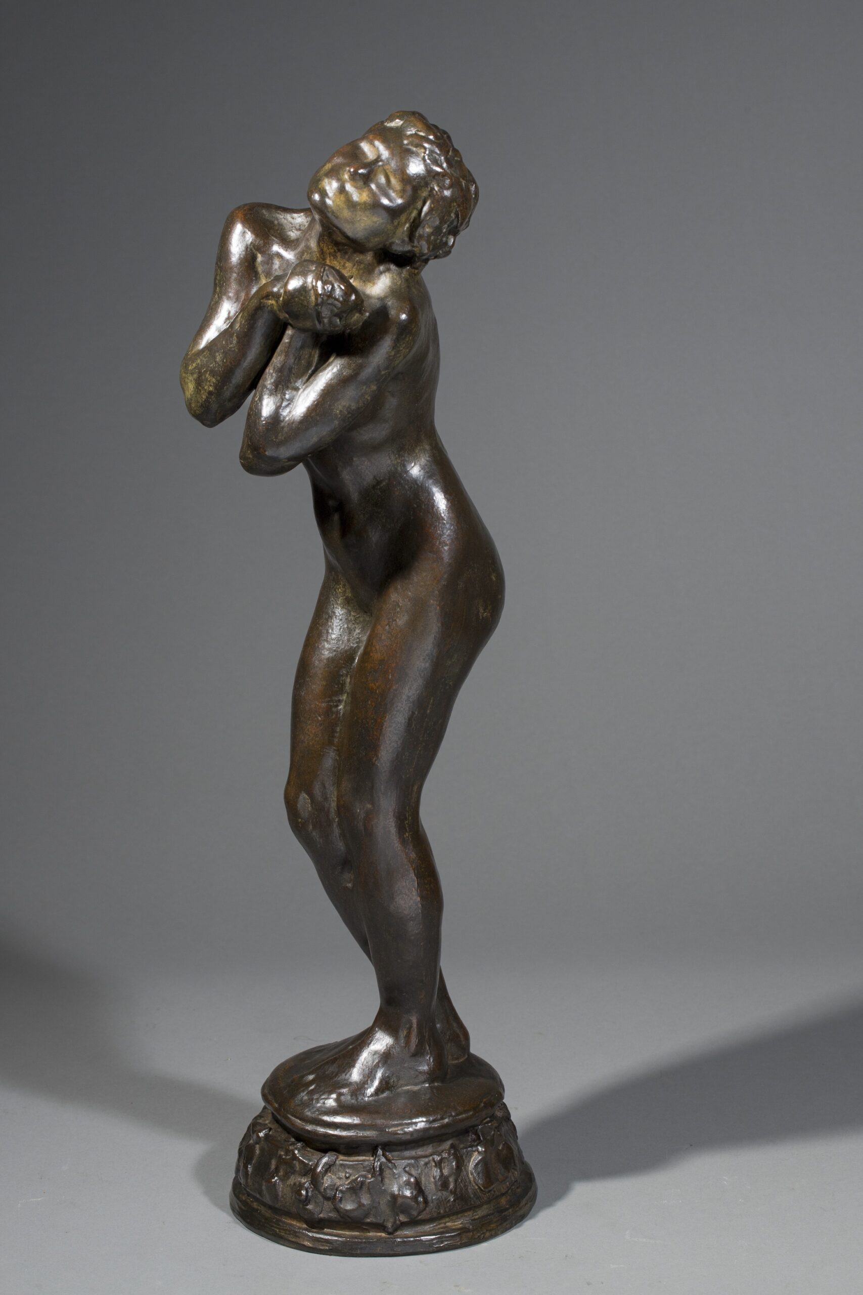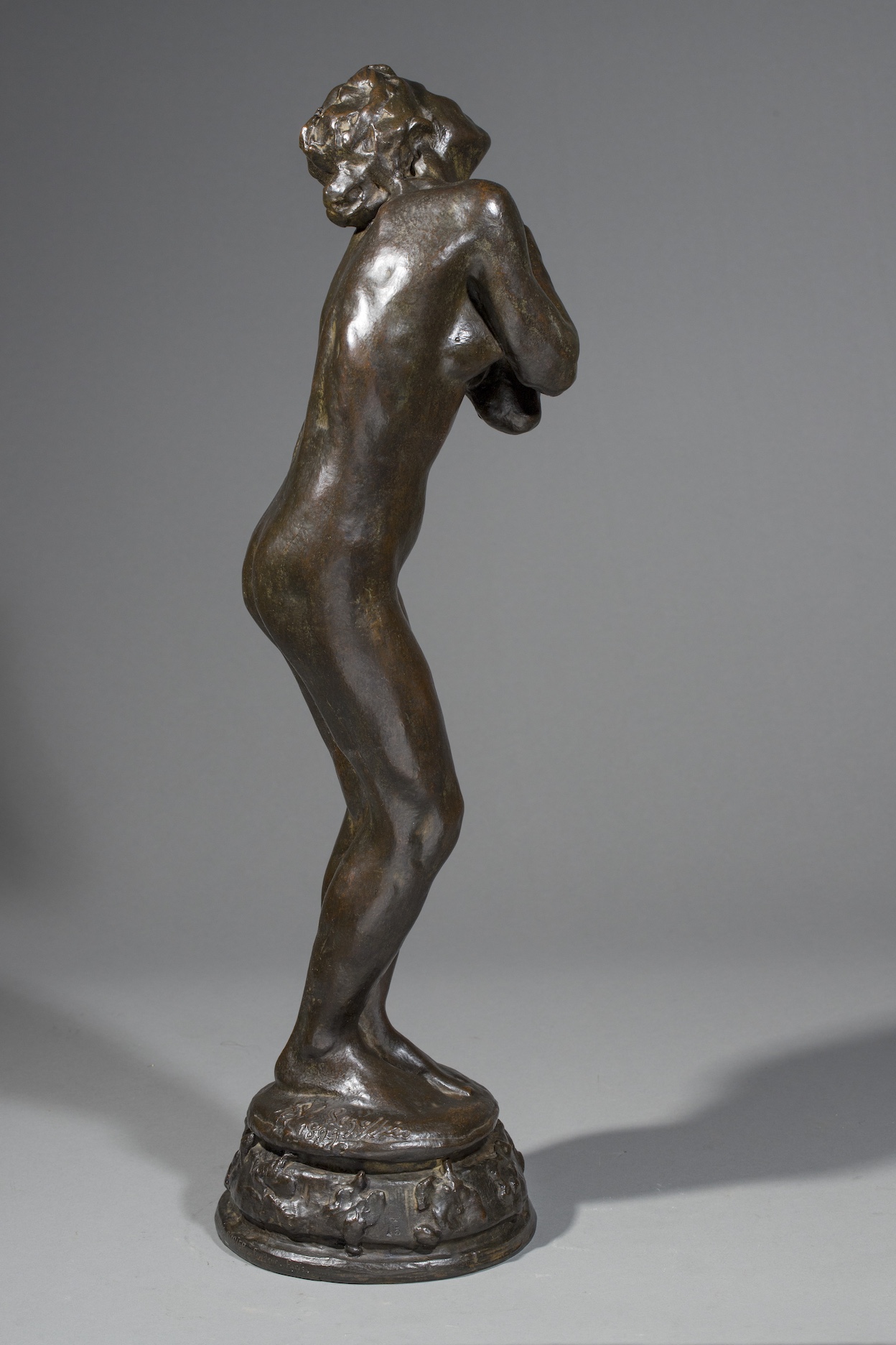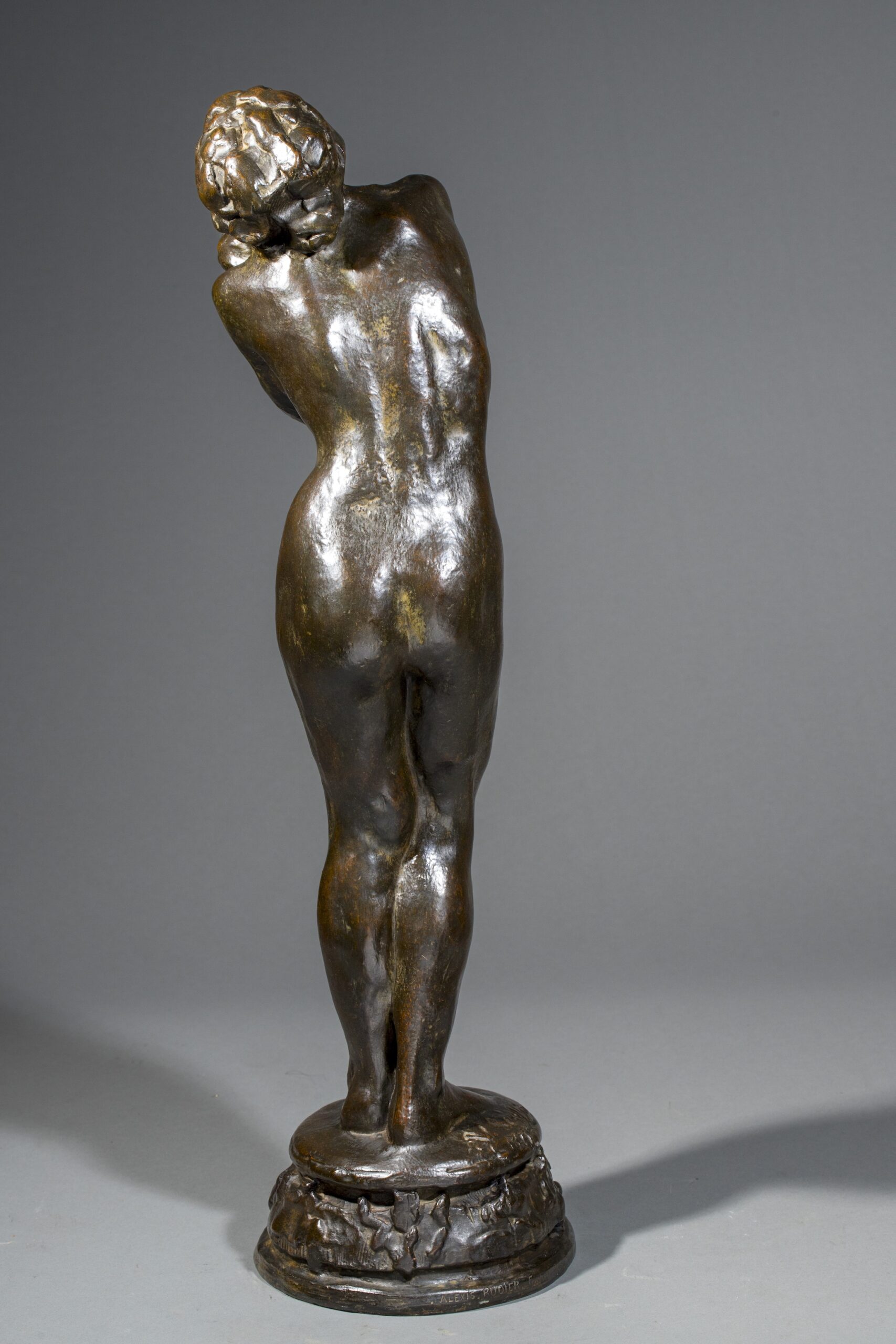 Exécutée en 1899, exposée le 26 mai 1900, puis envoi de Rome le 6 juin 1900, la Suppliante (plâtre) a été exposée au Salon des artistes français en 1901. C’est une oeuvre dans laquelle l’influence de Camille Claudel et Rodin est sous-jacente ; elle rappelle, par ses dimensions et son titre, certaines des femmes damnées du tympan de la Porte de l’Enfer. Comme nous l’indique Luce Rivet dans ses propos sur l’art de Segoffin « le modelé, compromis entre les leçons de Barrias, de Falguière et l’art de Rodin, affirme une palpitation de surface à l’antithèse de la froideur « académique » (opus cité-supra, page 280). C’est bien cette même ferveur aux accents rodiniens que l’on peut admirer dans notre statuette. Dans les tirages, les bronzes portent souvent comme ici, en plus de la signature, un cachet frappé, formé entre autres des initiales du sculpteur.