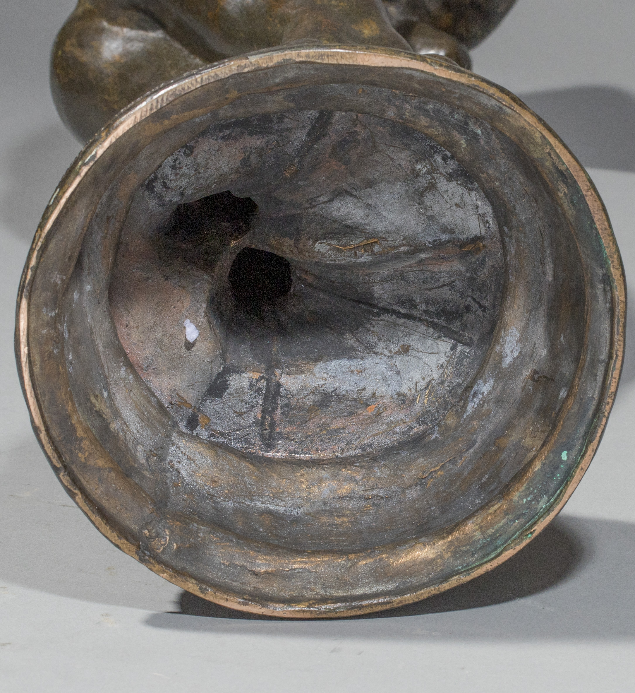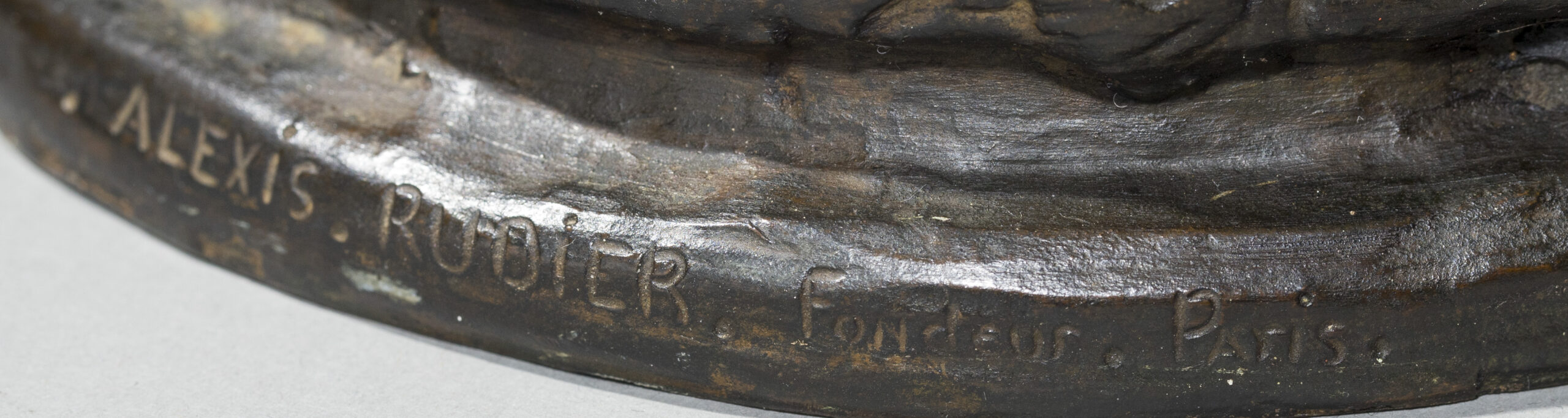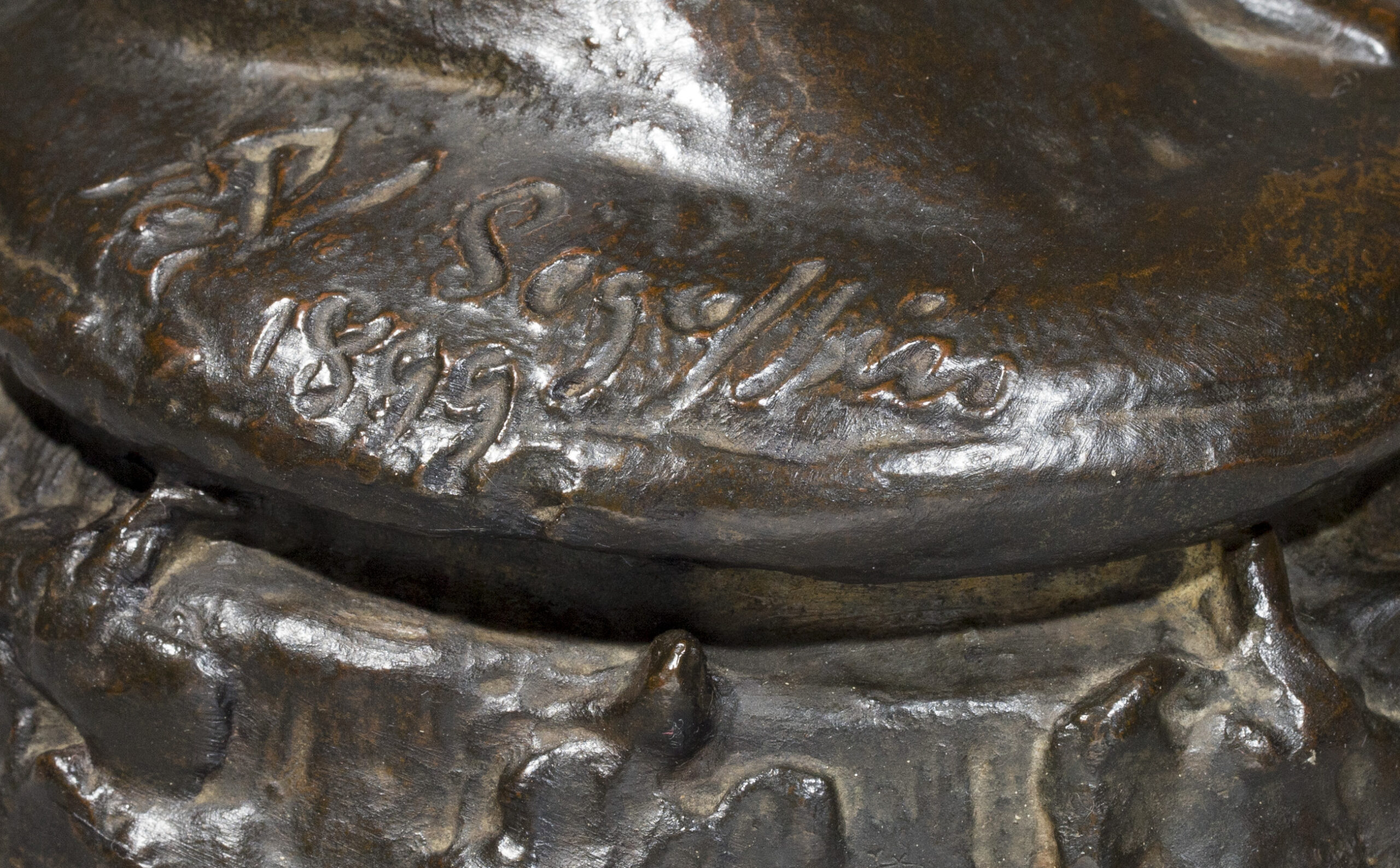 Exécutée en 1899, exposée le 26 mai 1900, puis envoi de Rome le 6 juin 1900, la Suppliante (plâtre) a été exposée au Salon des artistes français en 1901. C’est une oeuvre dans laquelle l’influence de Camille Claudel et Rodin est sous-jacente ; elle rappelle, par ses dimensions et son titre, certaines des femmes damnées du tympan de la Porte de l’Enfer. Comme nous l’indique Luce Rivet dans ses propos sur l’art de Segoffin « le modelé, compromis entre les leçons de Barrias, de Falguière et l’art de Rodin, affirme une palpitation de surface à l’antithèse de la froideur « académique » (opus cité-supra, page 280). C’est bien cette même ferveur aux accents rodiniens que l’on peut admirer dans notre statuette. Dans les tirages, les bronzes portent souvent comme ici, en plus de la signature, un cachet frappé, formé entre autres des initiales du sculpteur.