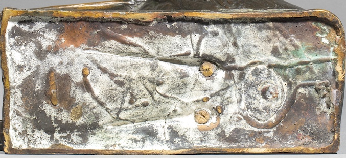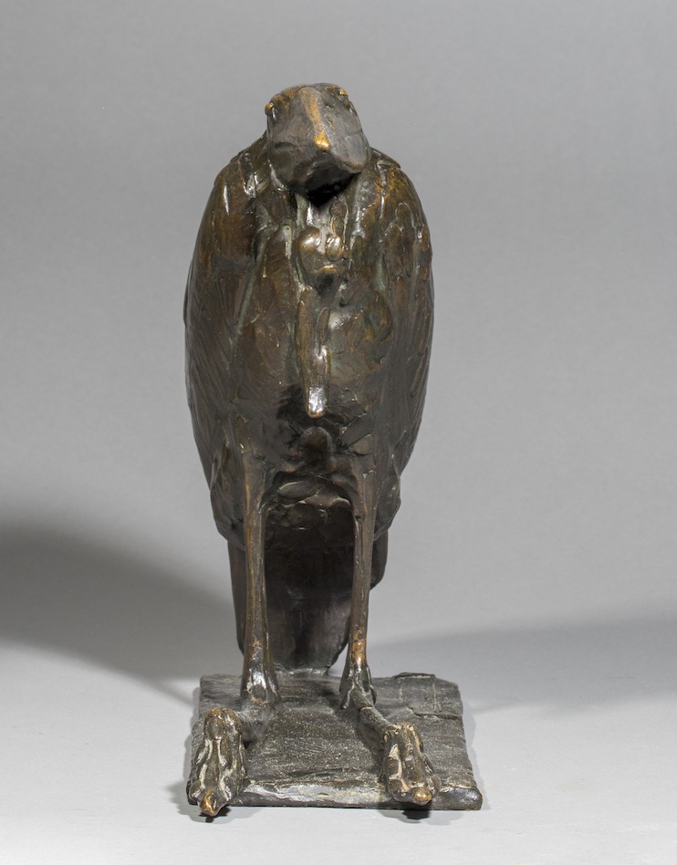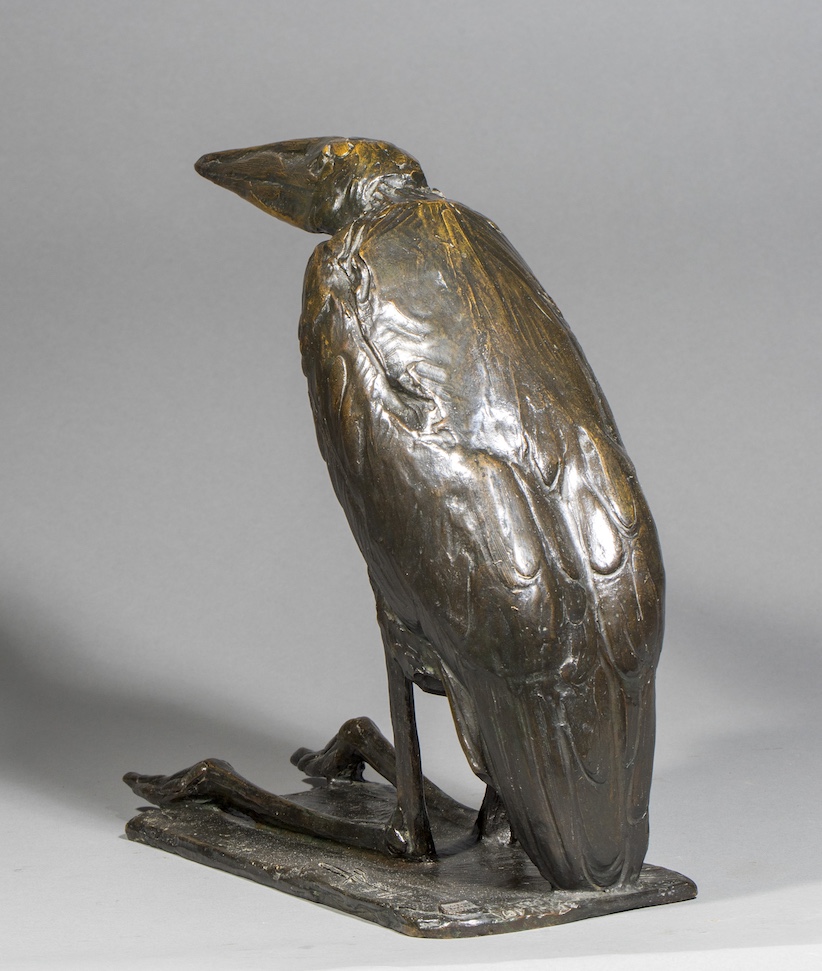 C’est dans ce contexte que Bugatti modèle, vers 1907, ses sculptures de marabouts. Il réalise d’abord Les Marabouts, l’un contre l’autre, groupe empreint d’empathie, où il exalte le lien, l’attachement et la réciprocité entre deux êtres vivants. À l’inverse, Marabout au repos, notre modèle, incarne la solitude acceptée, presque intériorisée. L’oiseau y est représenté immobile, le bec et les longues pattes repliées formant deux lignes parallèles qui se fondent dans la masse dense du corps aux ailes closes. La synthèse radicale des volumes, conjuguée à un modelage sobre et précis du plumage, confère à l’œuvre une intensité expressive rare que la belle patine noire de notre exemplaire ne fait que rehausser.