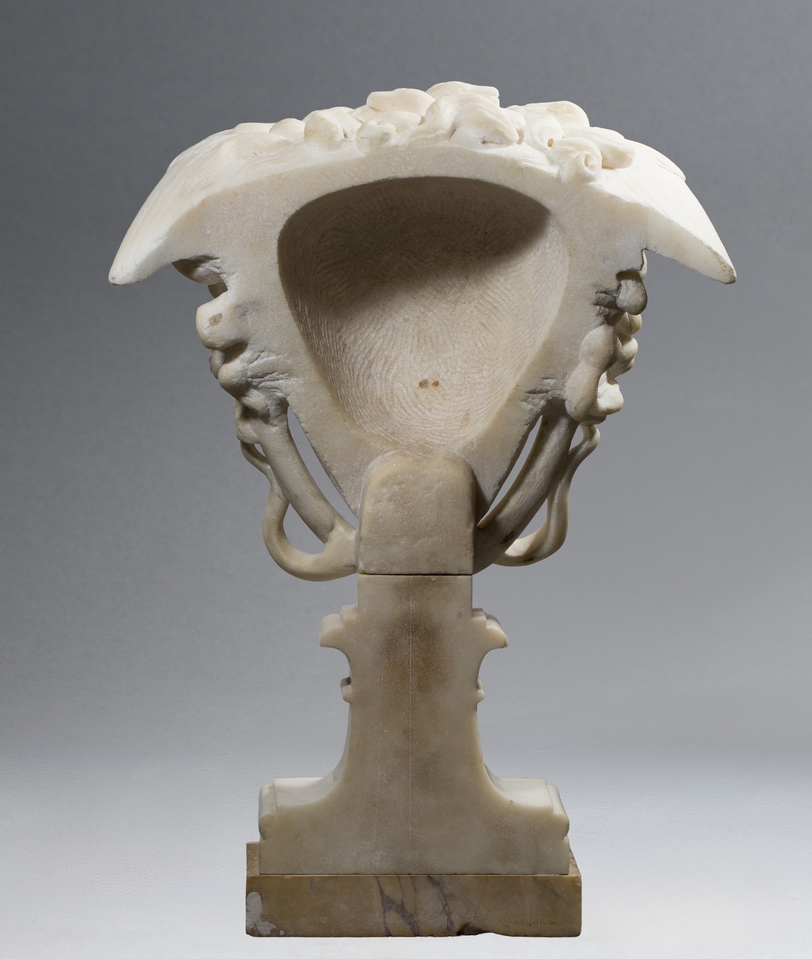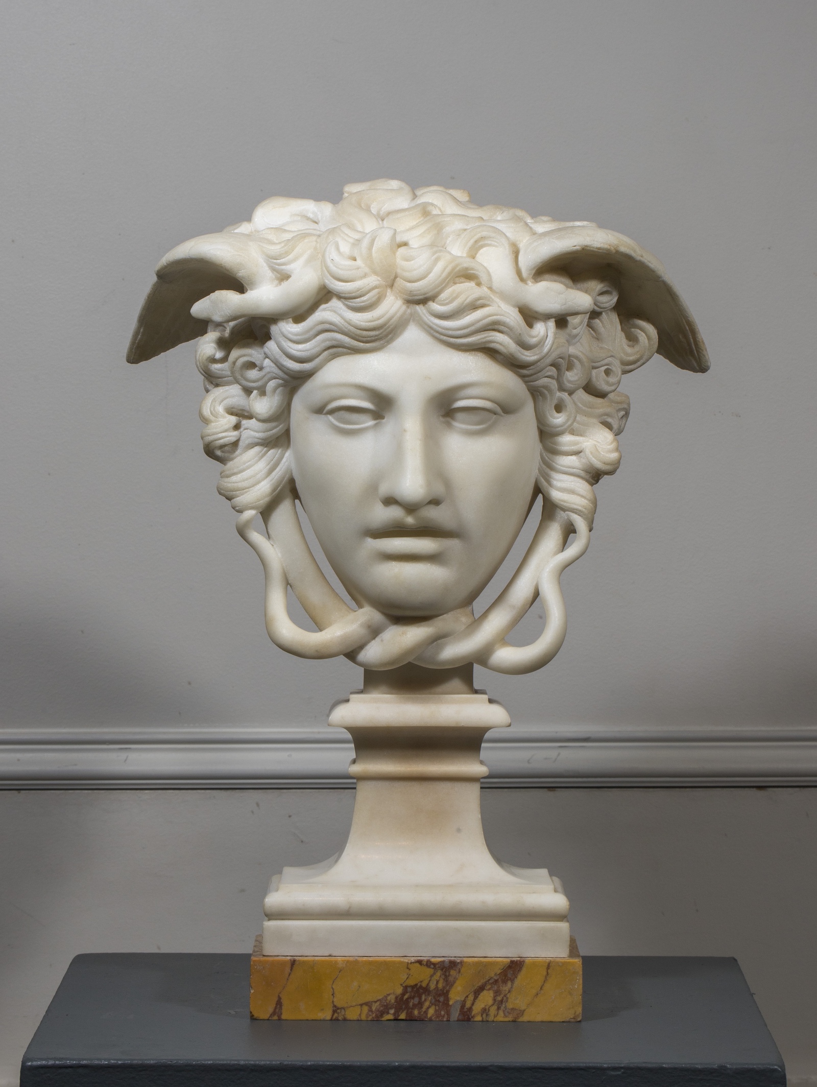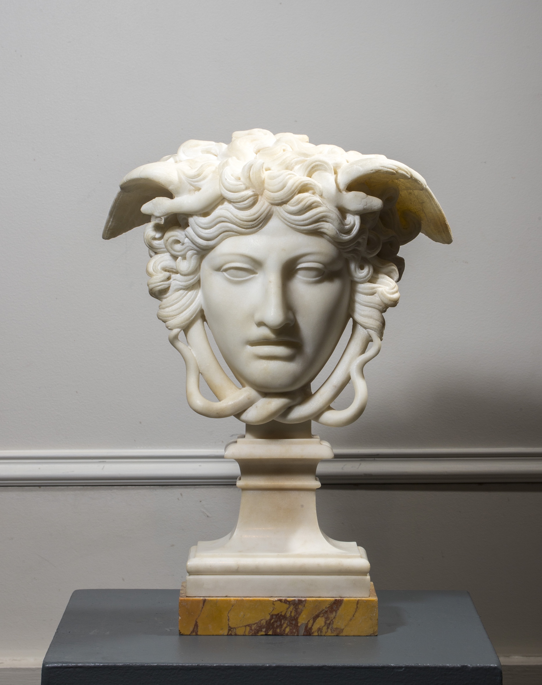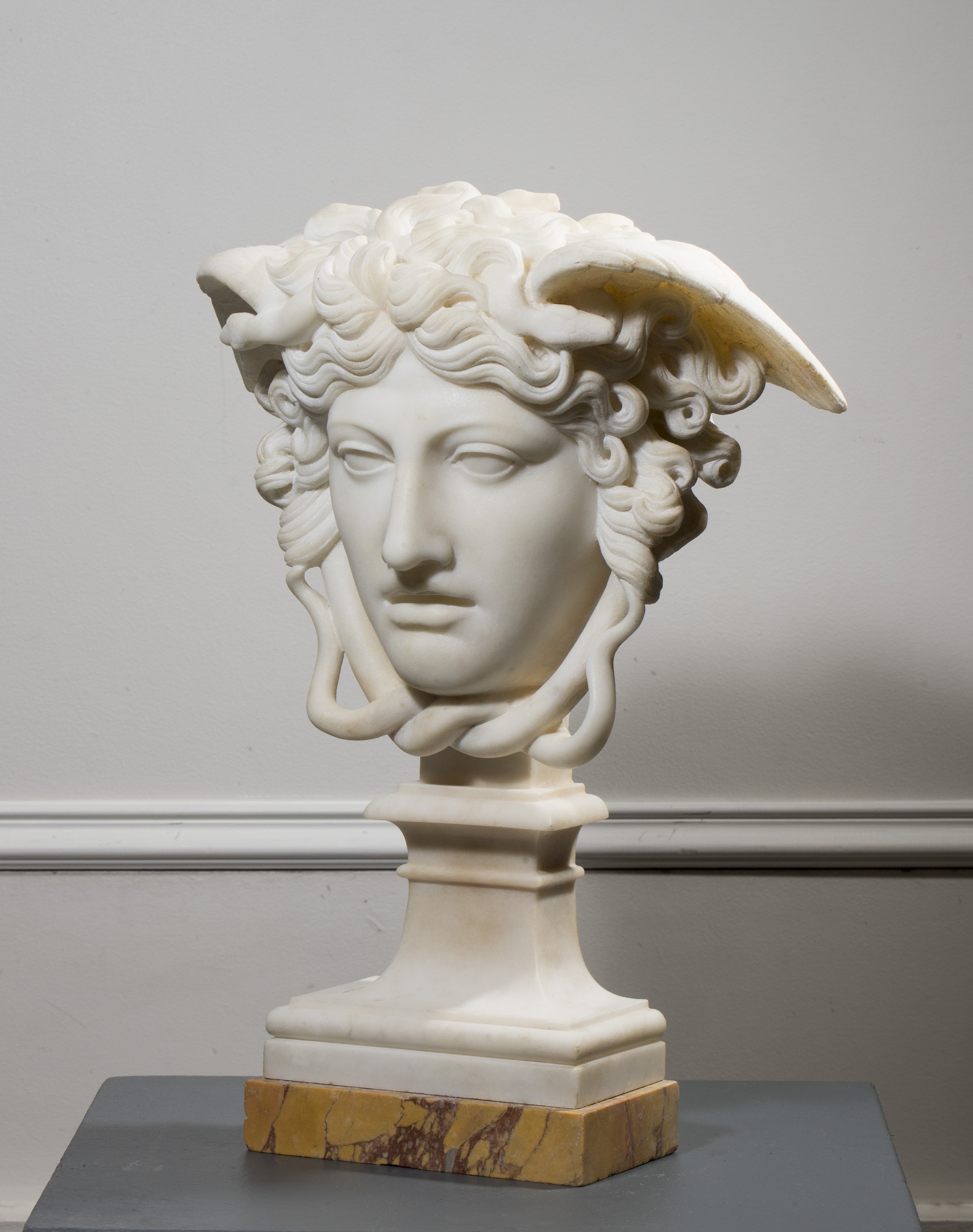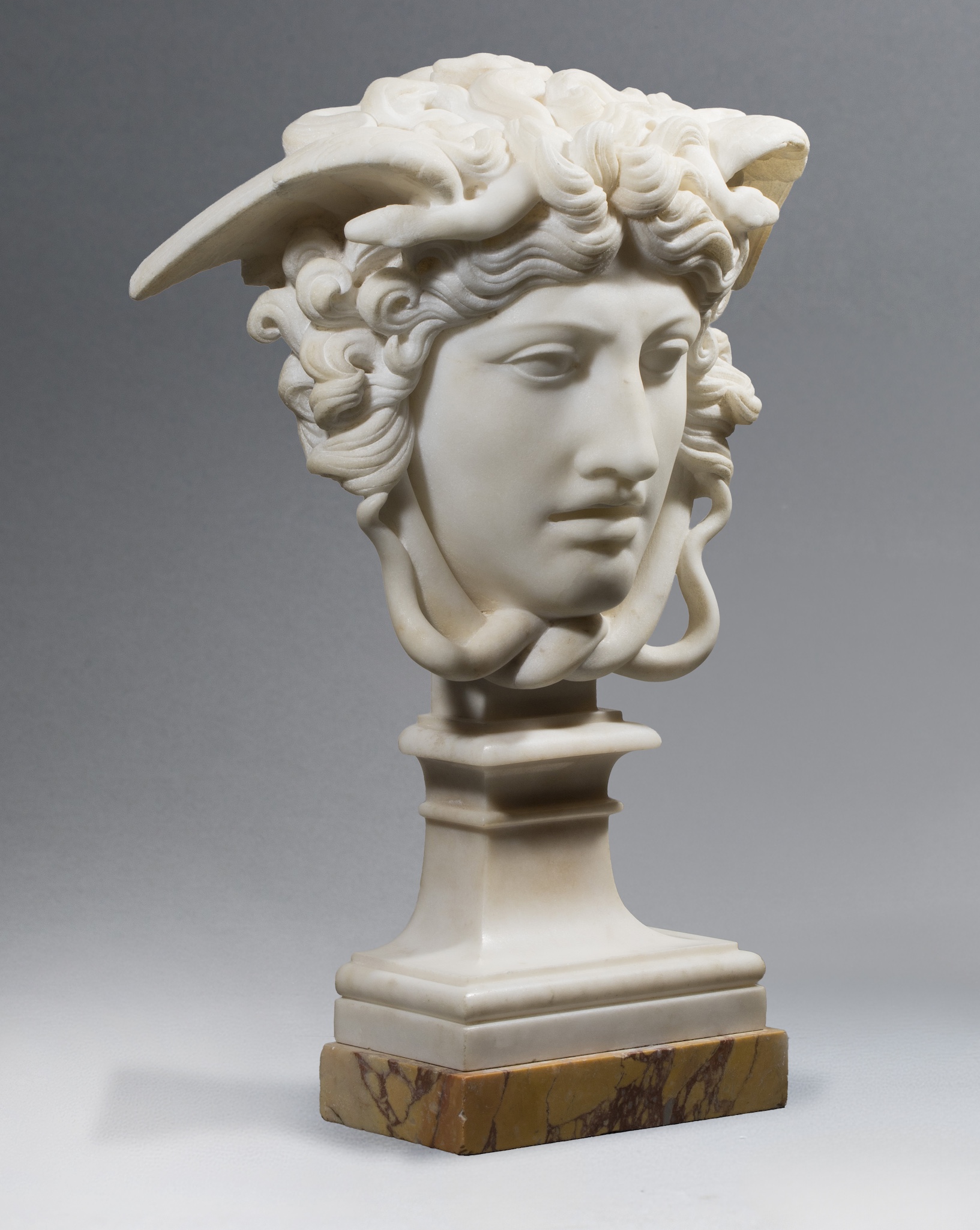 Sculpture en marbre blanc sur socle en marbre jaune de Sienne.