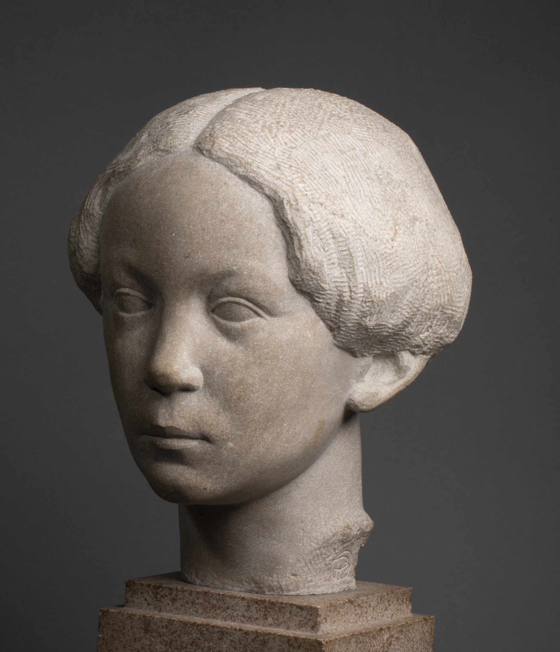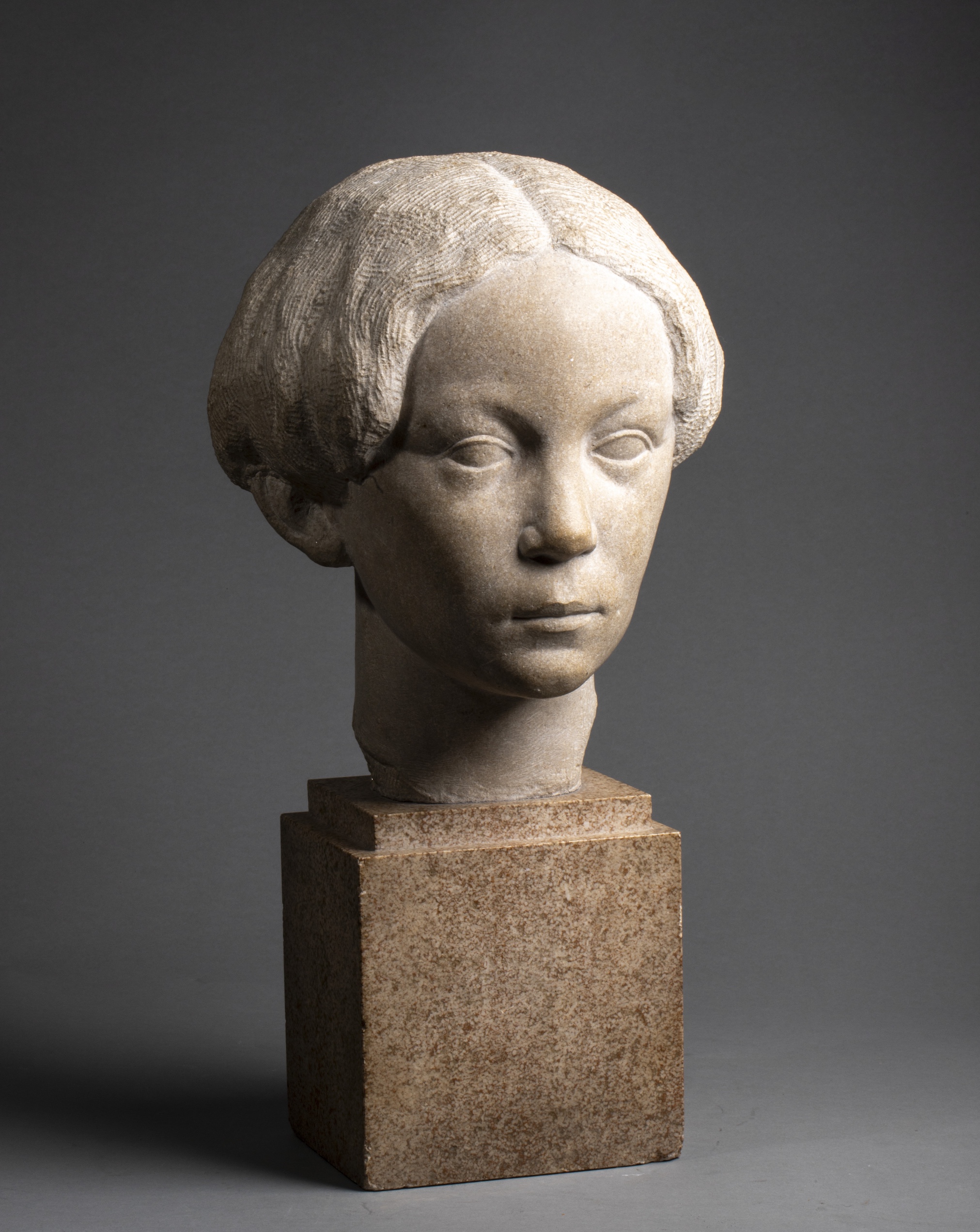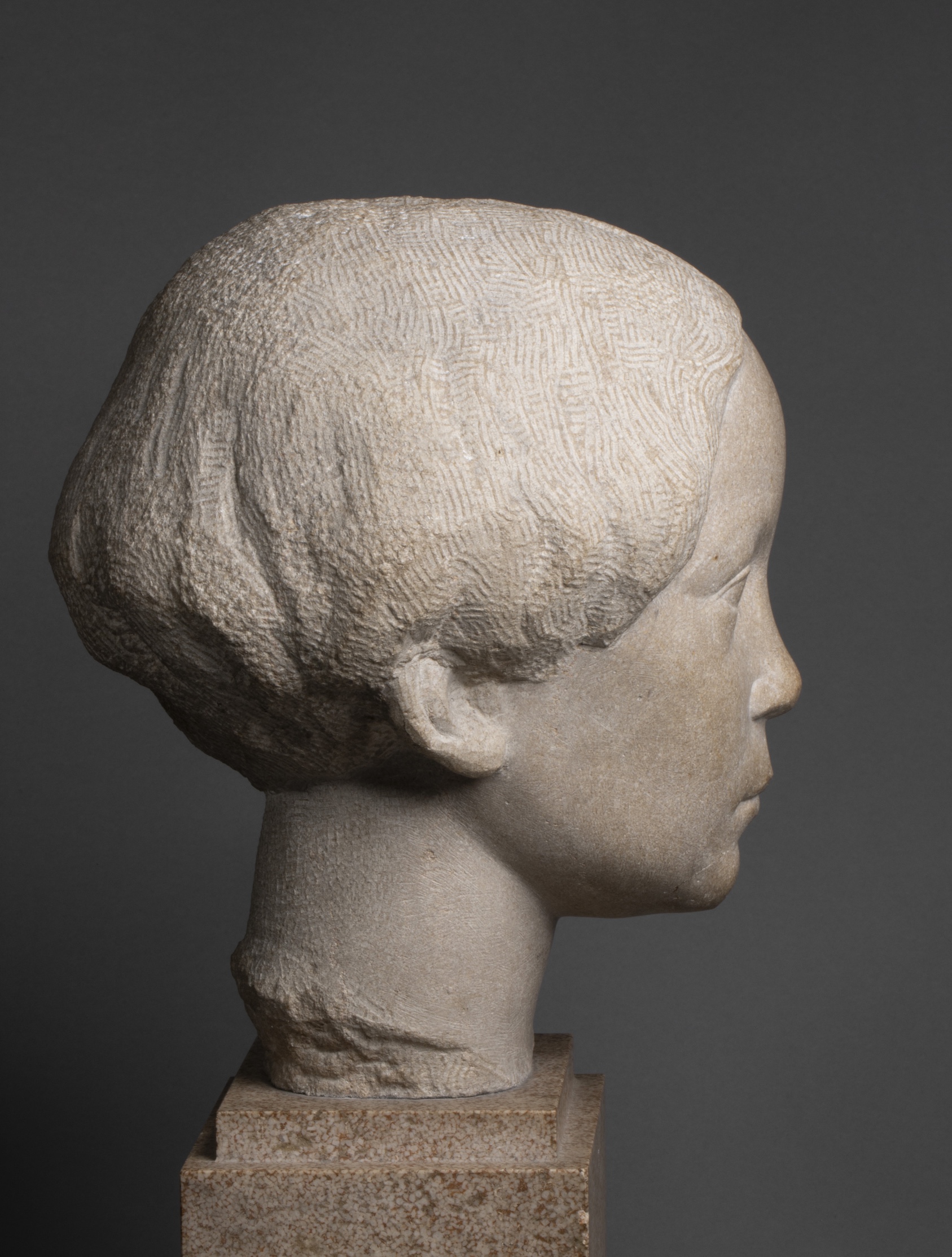 Pommier aimait avant tout analyser la physionomie humaine ; ce sculpteur, qui était en même temps un médailleur, savait interpréter ce qu’un visage offre de caractéristique et il en fixait la structure avec franchise. C’est bien cette recherche de l’épure et de l’essentiel que l’on retrouve dans notre Tête d’enfant, attachante par la noblesse et la simplicité de ses lignes ; la pureté des traits au repos se dégage de la masse compacte et divisée de la chevelure alors que le regard en amande semble fixer l’éternité devant lui, tout comme dans cet autre Buste de Melle Corrard (bronze) réalisé par le sculpteur en 1931 (Paris, centre Pompidou).
